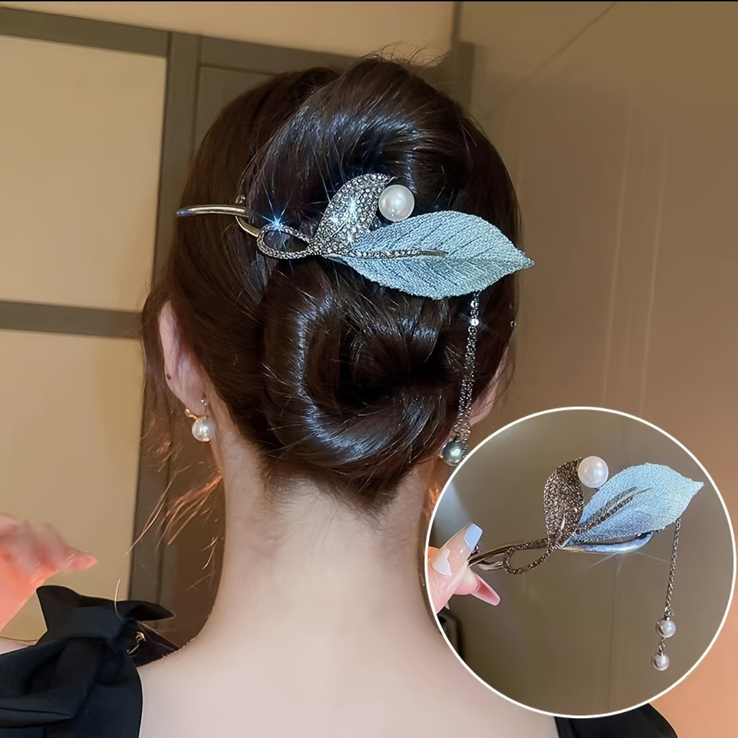 1 Piece Leaf Tassel Headdress, Rhinestone Pearl Button Hair Clip, Zinc Alloy Handmade Embroidery Hair Accessories, Suitable For Daily Use