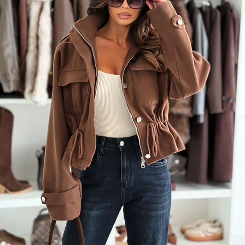 Autumn Elegant Lapel Collar Short Jacket Winter Women Fashion Zipper Button Solid Color Coats Causal Long Sleeve Loose Outercoat