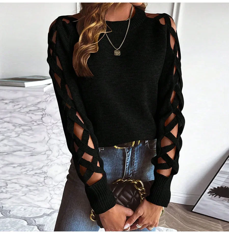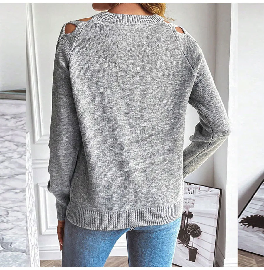 Autumn Winter Women Solid Casual Pullover Sweater Women Fashion Cutout Long Sleeve Knit Crew Neck Pullover Top 2025 New