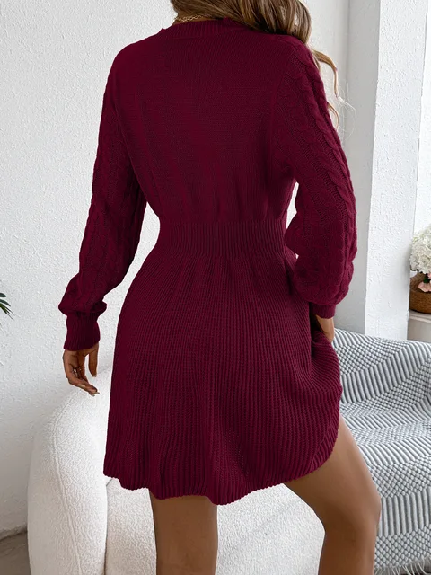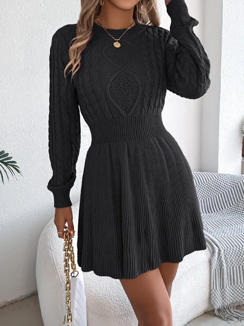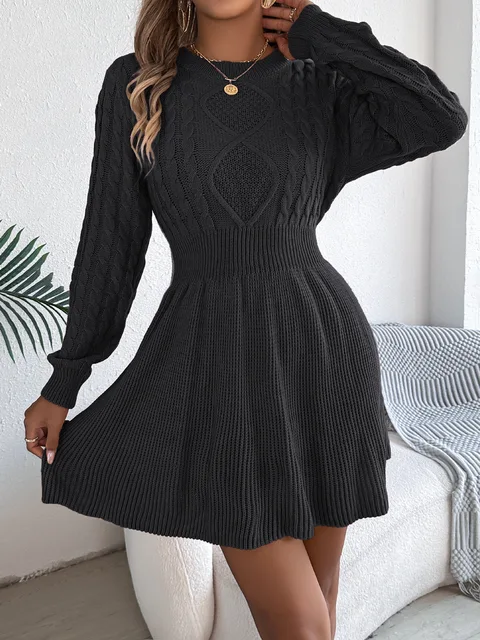 - Product Name: Cable Knit Female's Autumn Dress Round Neck Solid-Color Waist-Cinched Lantern Sleeve Lady's Dress Pullover Dress For Women