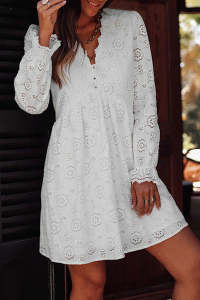 Material Cotton. Nylon Style Casual Pattern Type Solid Color. Hook Flower Element Buttons Neckline V Neck Silhouette A Line Sleeve Style Petal Sleeve Sleeve Length Long Sleeve Type Solid Color Size(in) Bust Dresses Length Sleeve Length S/M 19.7 37.8 24 L/XL 21.1 38.6 24.4 Tips:
