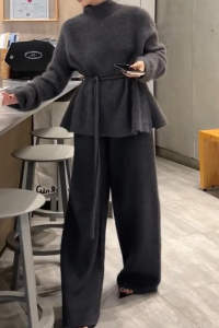 - Tag: Long Sleeve , Loose , Casual , Solid Color , Long , Polyester , Two-pieces , Regular Sleeve , Knitting , Turtleneck , Wide Leg , Elastic Waist , Lace Up