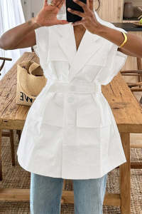 - Product Name: Casual Solid Bandage Pocket Buttons Turn-back Collar Tops