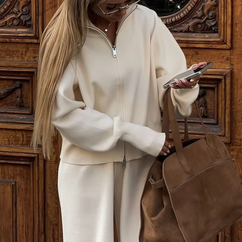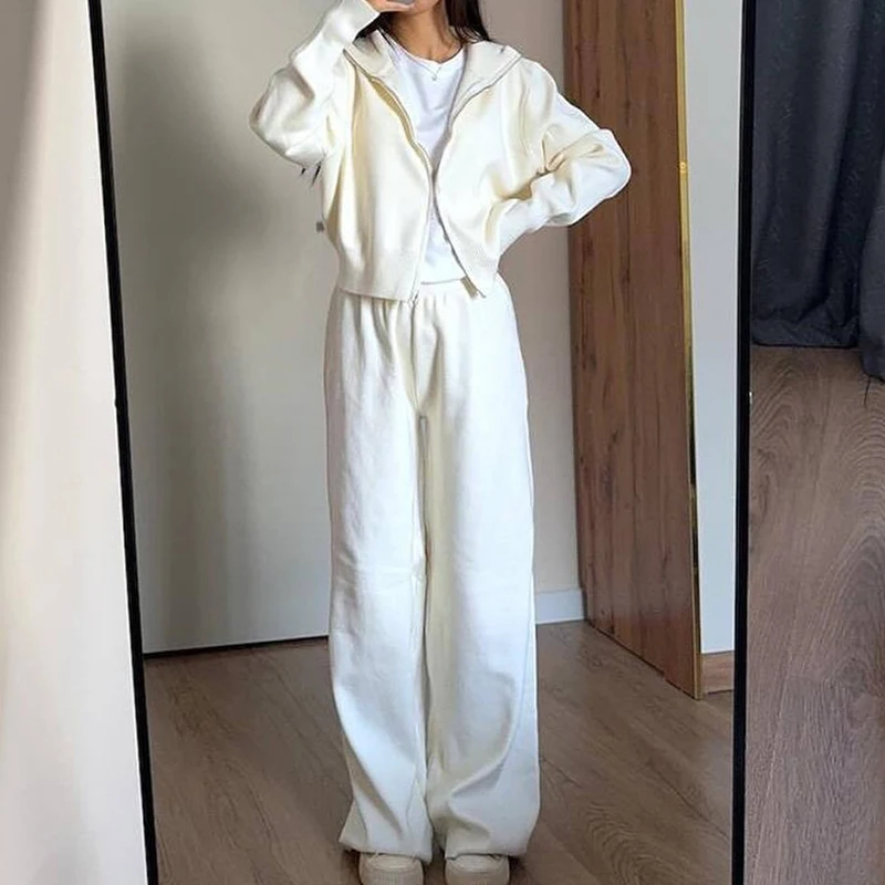 - Product Name: Casual Zipper Jacket Commuter Suit Simple Solid Color Streetwear Long Pants Outfits Autumn Winter Knitted Women's Two Piece Sets