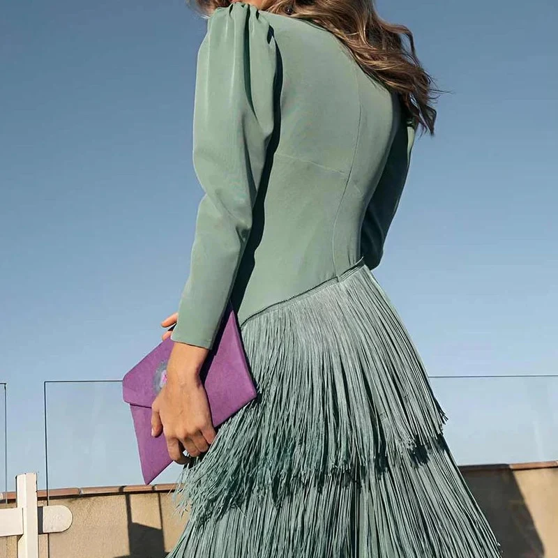 - Product Name: Chic High Waist Pleated Tassel Hem Dress Fashion Solid Color Women Banquet Dresses French Style V-neck Long Sleeve Evening Dress