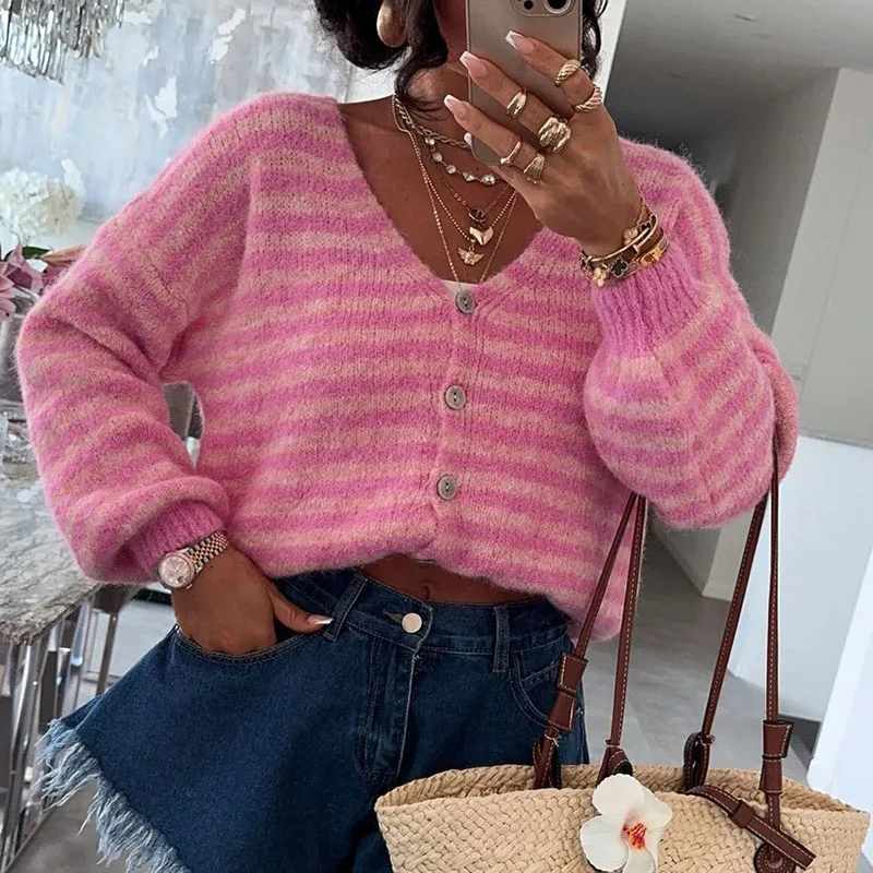- Product Name: Color Blocking Striped Autumn Winter Cardigan Sexy Women's V-neck Long Sleeved Loose Sweater Elegant Holiday Warm Knitted Coat
