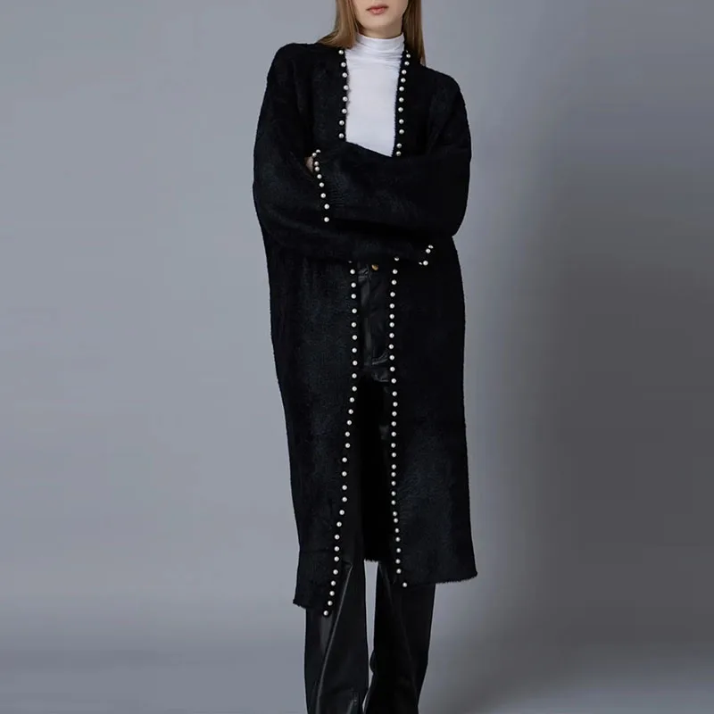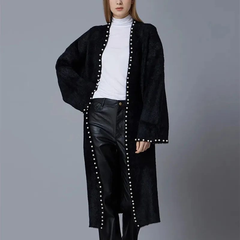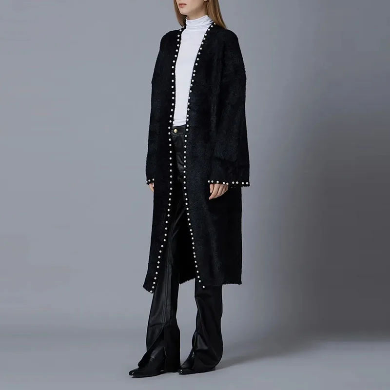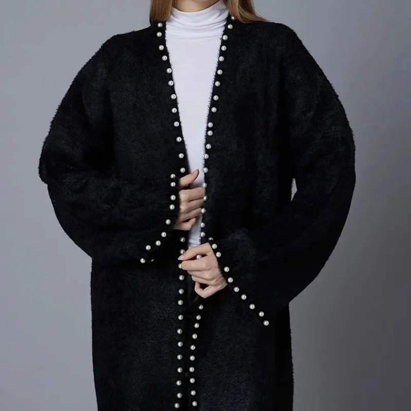 Elegant Beaded Mink Fleece Long Cardigan Autumn Winter Casual Long Sleeve Loose Design Outercoat Women Fashion Solid Knit Coat