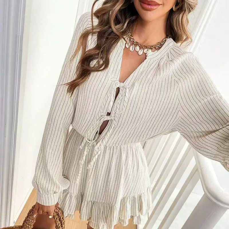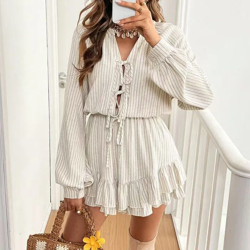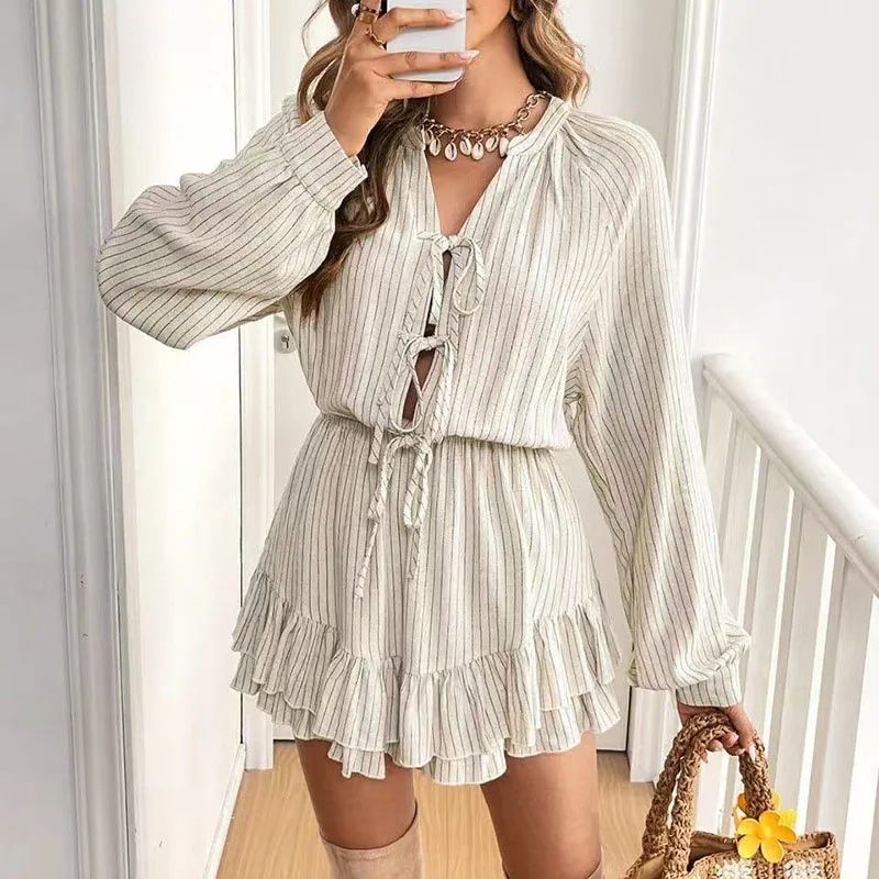 • Product Name: Elegant Lady Simple Loose Commute Mini Dress Leisure Stripe Printed Linen Short Dress Autumn New Long Sleeve V-neck Tie Up Dress