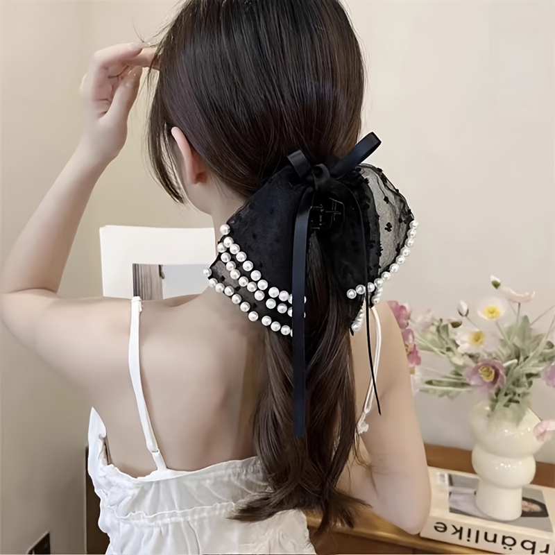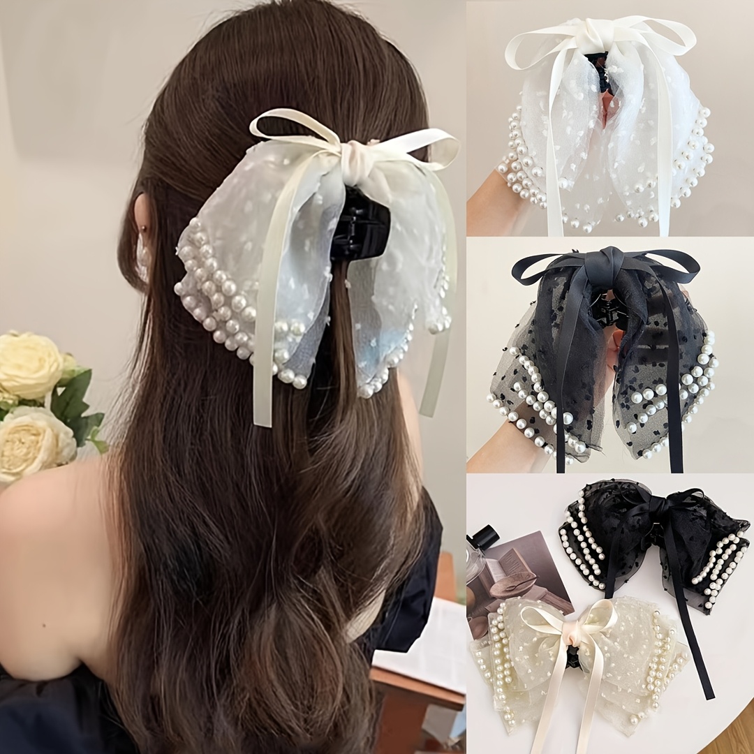 Elegant Large Bow Hair Clip with Pearl and Lace Details - Perfect for Spring and Summer, Ideal for Daily Wear, Commuting, and Special Occasions, Commuting Accessory|Elegant Hair Accessory|Durable Plastic Clip, Hair Clip