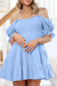 - Tag: Solid , Short Sleeve , Solid Color , Elegant , Fold , Off the Shoulder , Polyester , Short , Lantern Sleeve , Flounce , Cake Skirt