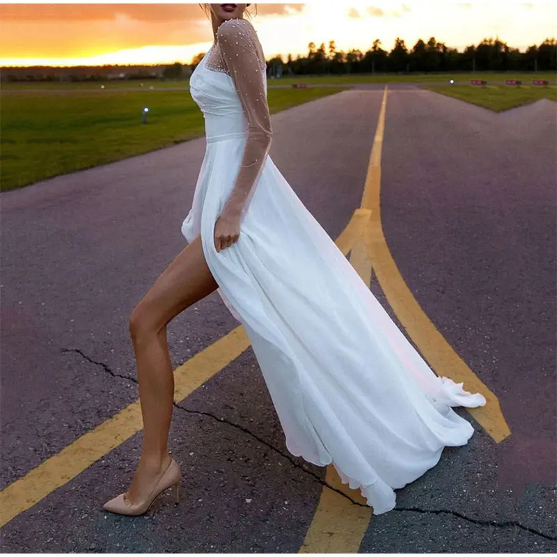 Fashion Mesh Long Sleeve Slit Elegant O-Neck Sequined Pleated Wedding Guest Dress
