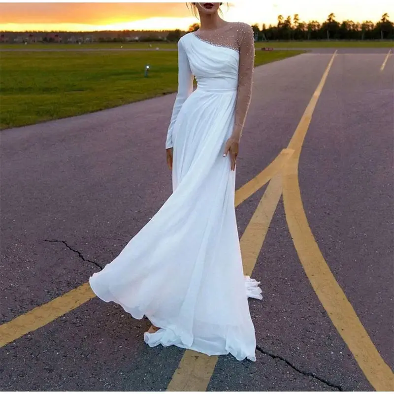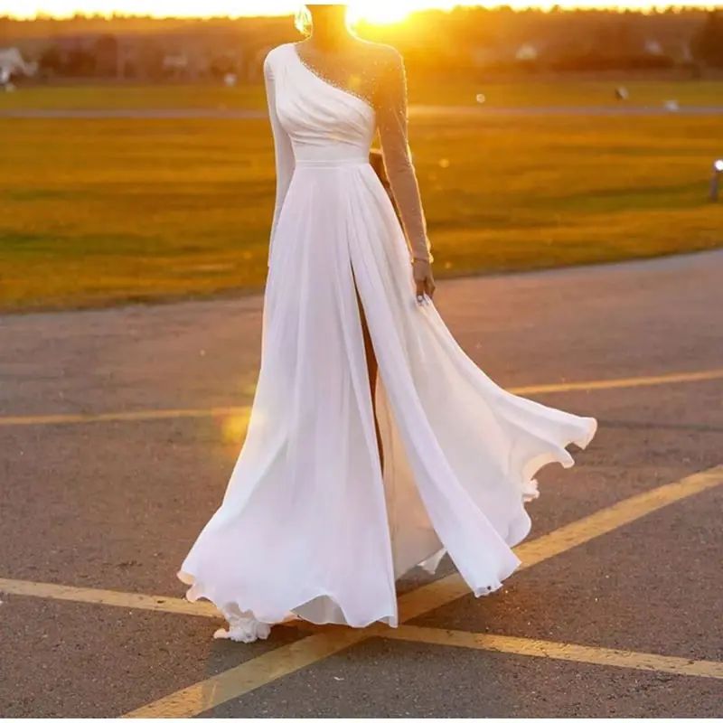 Home>Women's Clothing>Women's Dresses>Wedding Guest Dresses>Fashion Mesh Long Sleeve Slit Elegant O-Neck Sequined Pleated Wedding Guest Dress