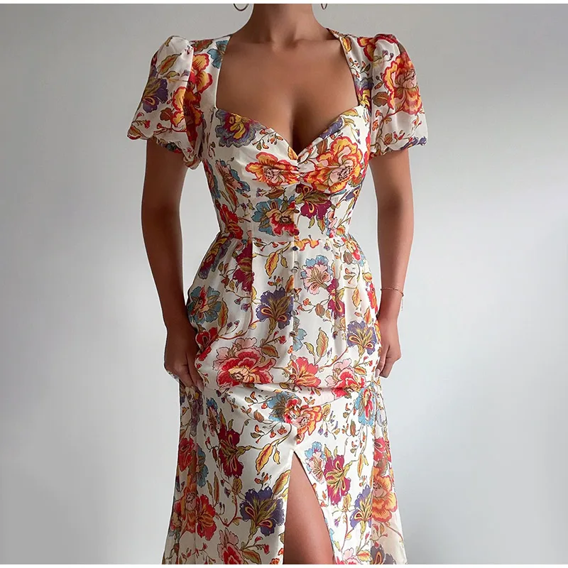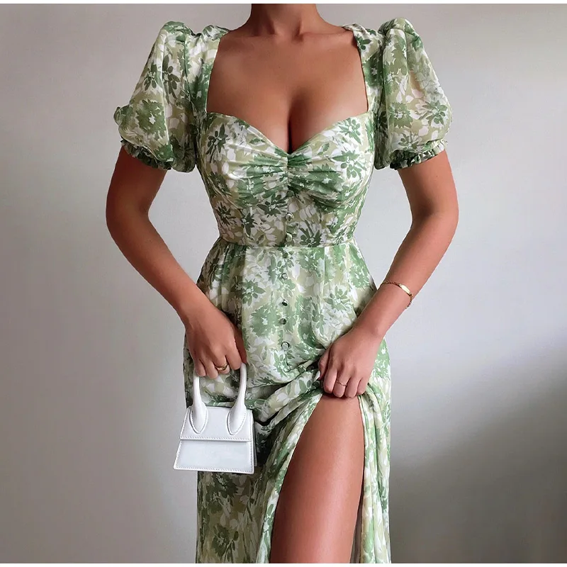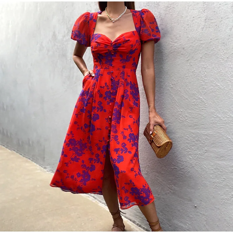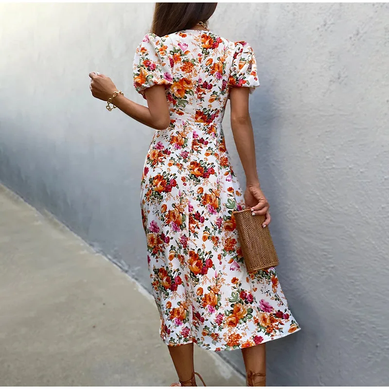 Brand Name:Plustide,Elasticity:Slight Strech,Sleeve Style:Puff Sleeve,Fabric Type:Polyester,Pattern Type:Floral,Fit Type:Slim,Silhouette:A-LINE,Neckline:V-Neck,
