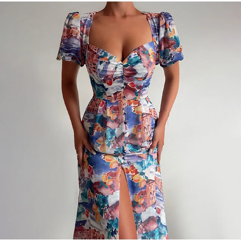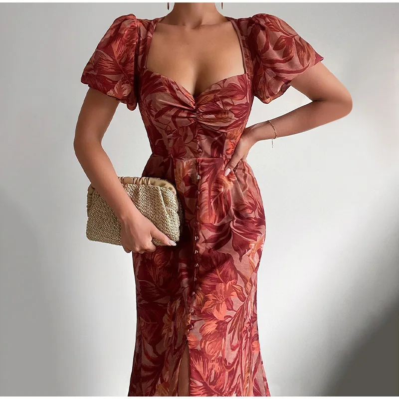 Fashion Off Shoulder Print Sexy Retro Elegant High Slit Ruffle Casual Maxi Dress