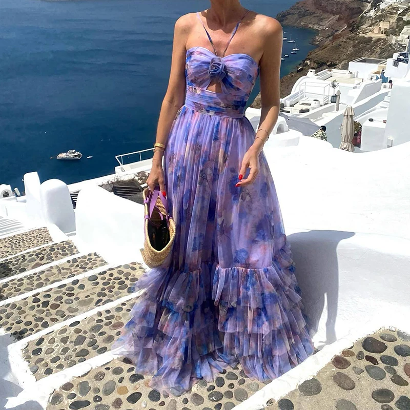 Home>Women's Clothing>Women's Dresses>Maxi Dresses>Layered Mesh Printed Women's Evening Dress Elegant Halter Off Shoulder High Waist Dress New Holiday Date Casual Long Dress