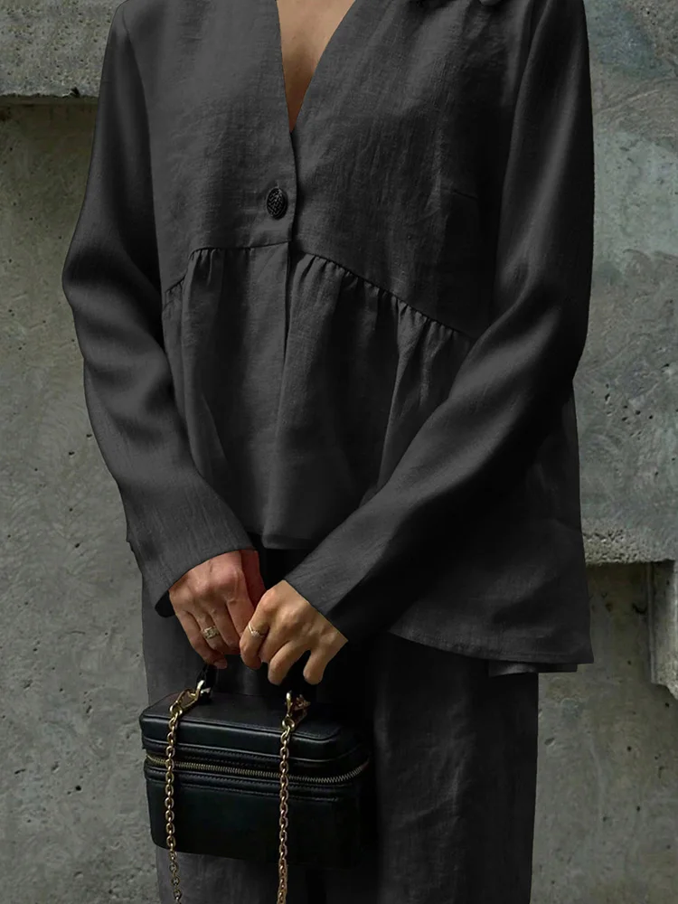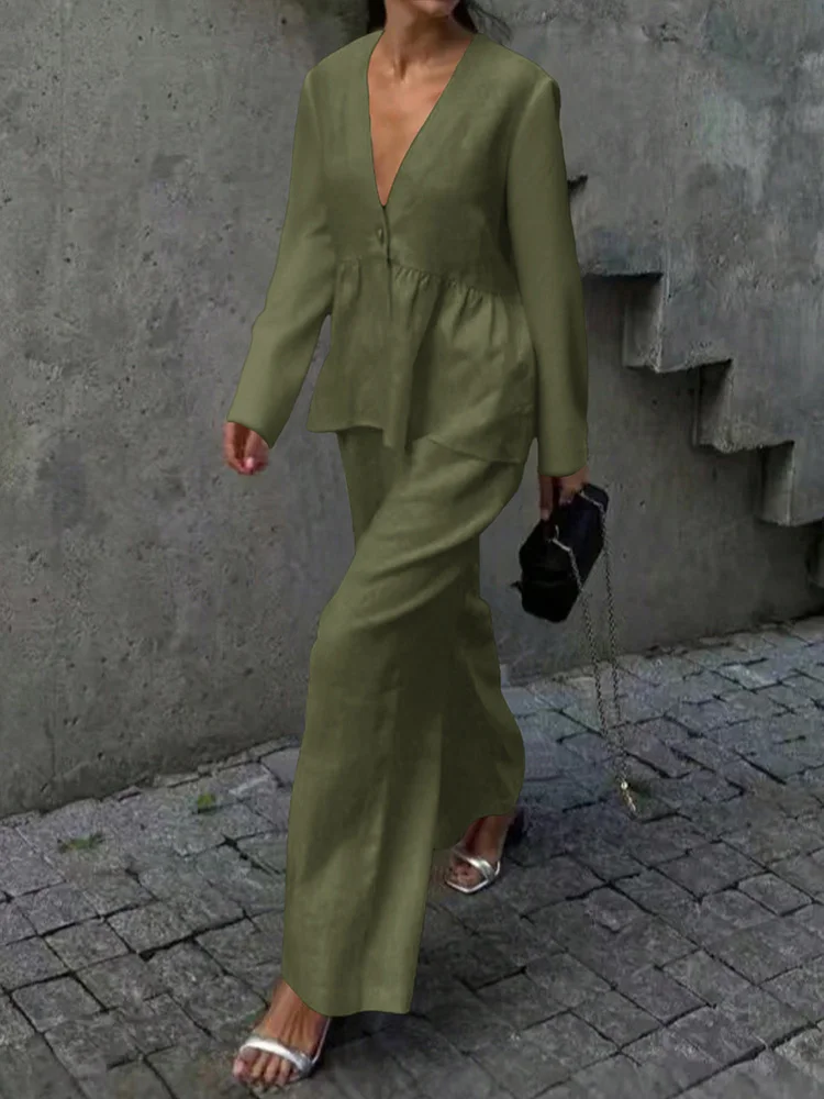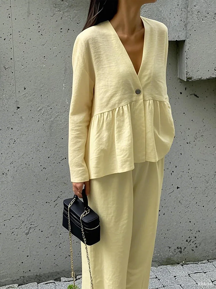 New Autumn V Neck Long Sleeved Top and Pants 2 Piece Set Simple Solid Color Home Wear Suit Casual Street Wear Vacation Outfits