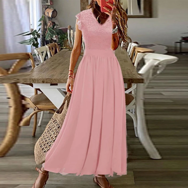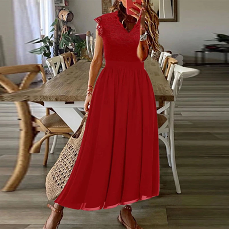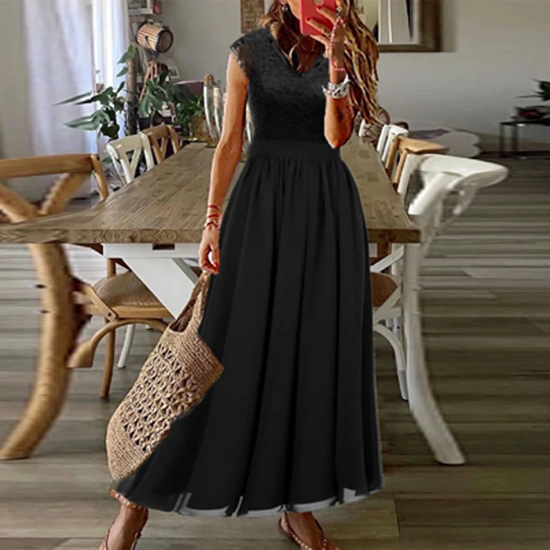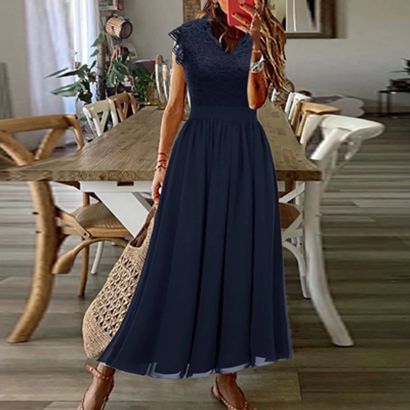 Sexy Lace Patchwork Fashion V-Neck Elegant Maxi Dress