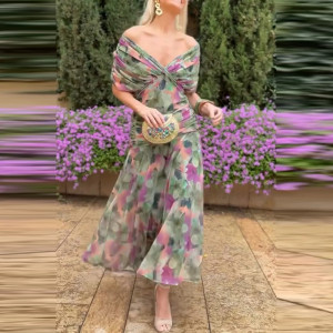 - Product Name: Sexy Off Shoulder Boho Swing Long Beach Dress Sexy High Waisted Chiffon A-line Dress Summer New Printed Shawl Collar Mesh Dress