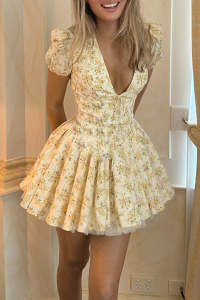 - Tag: V Neck , Print , Short Sleeve , Fold , Polyester , Sexy , Short , Frenulum , Full Print , Regular Sleeve , Waist Skirt , Flowers