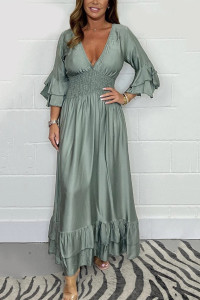 Solid Satin V-Neck Ruffle Sleeve Pleated Waist Maxi Dress