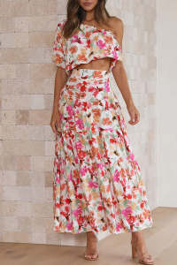 - Product Name: Sweet Elegant Floral Asymmetrical Oblique Collar Short Sleeve Two Pieces