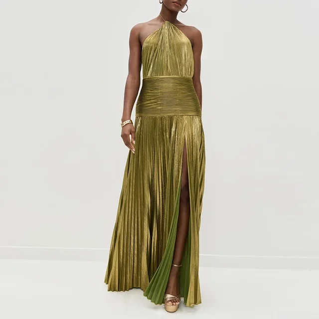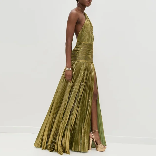 Vestido Woman Sexy Tie-up Halter Pleated Dress Spring Solid High Waist Slit Banquet Dress Elegant Backless Hollow Zip Boho Dress