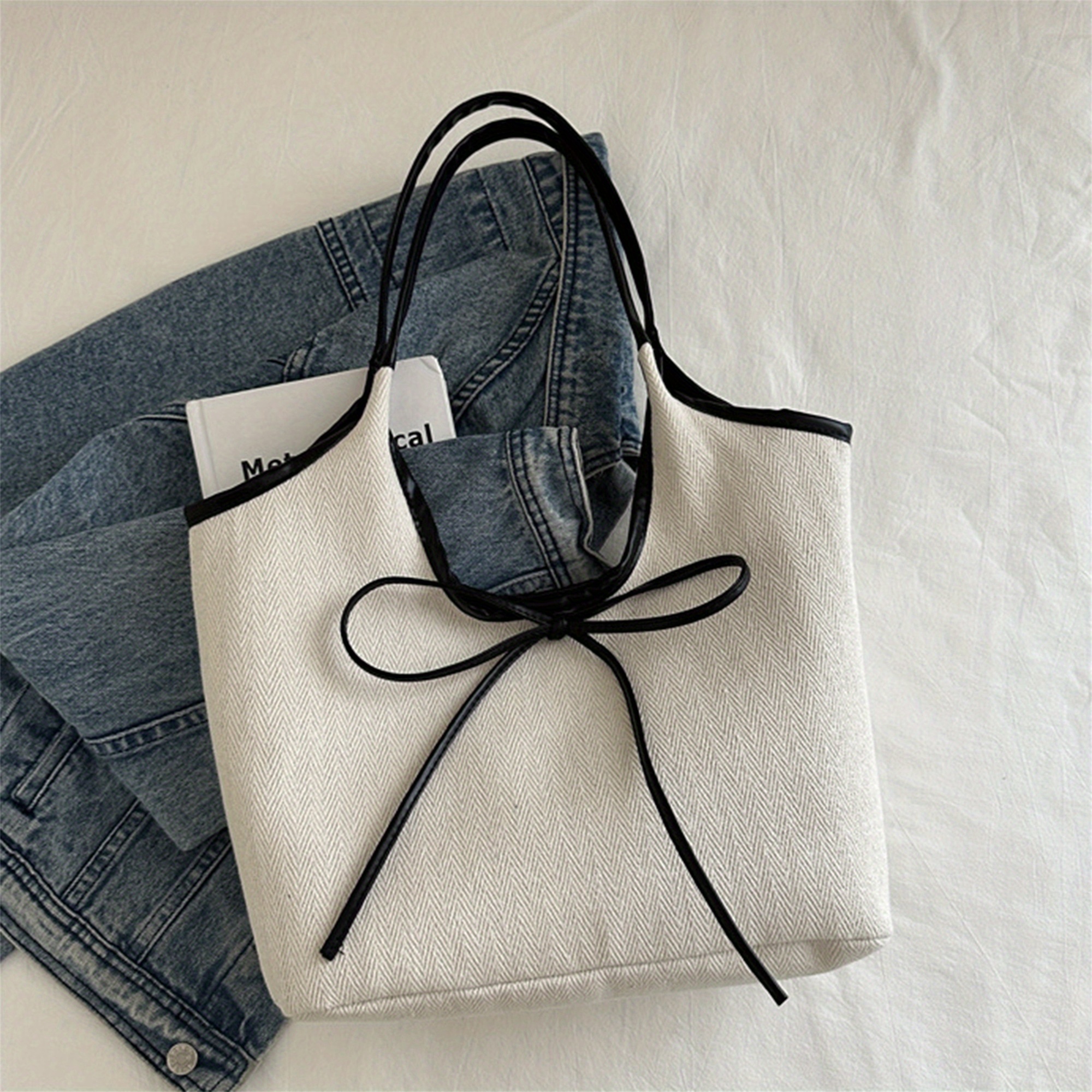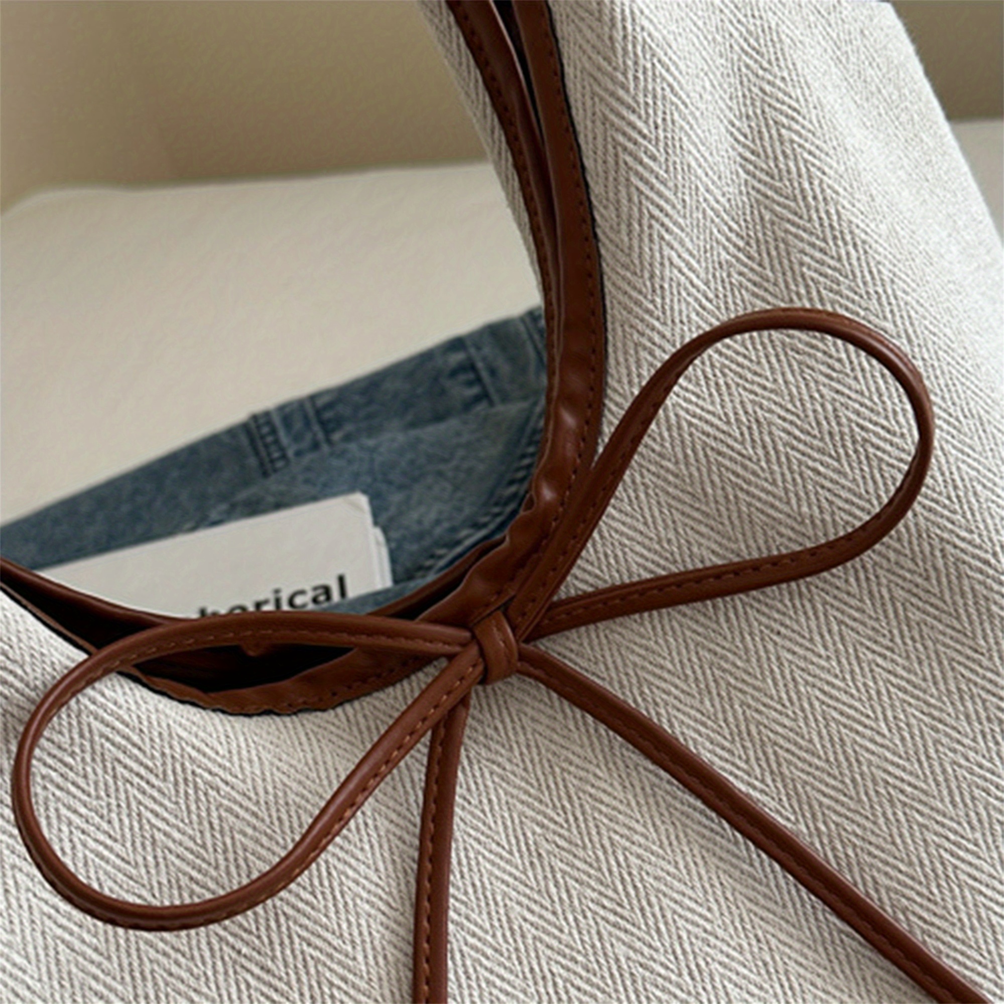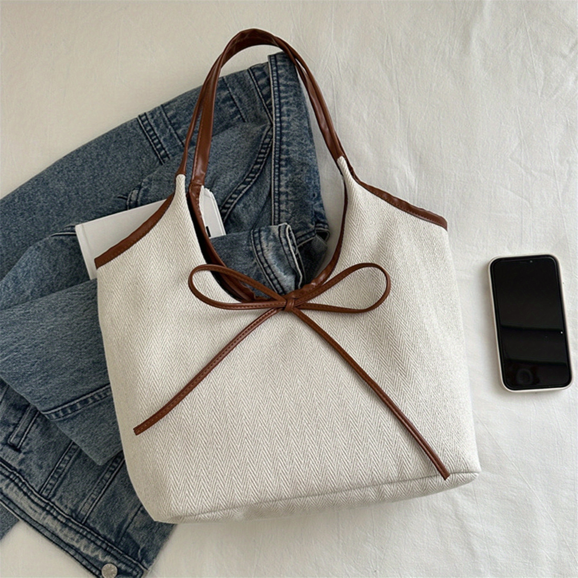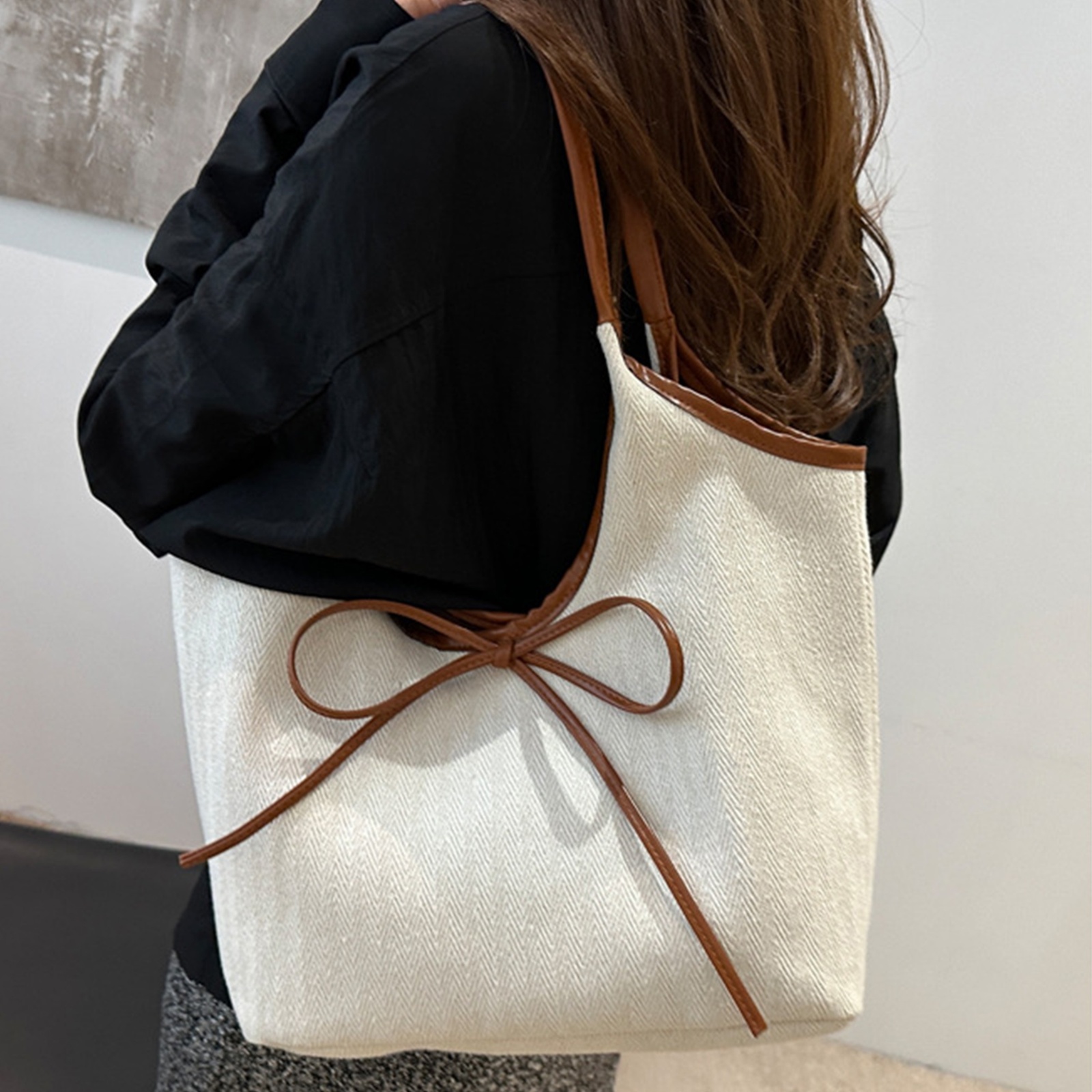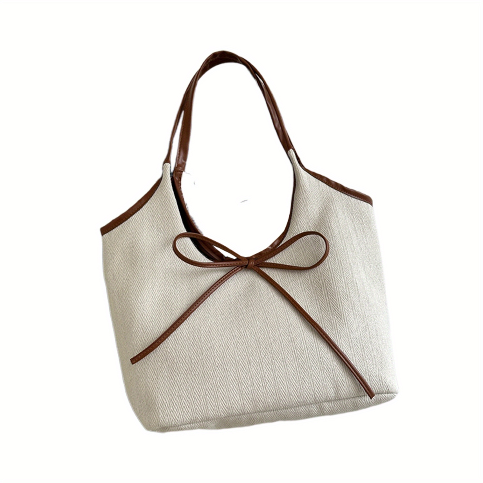 - Product Name: Women’s White Hemp Tote Bag – Spacious Handbag with Brown Bow Accent