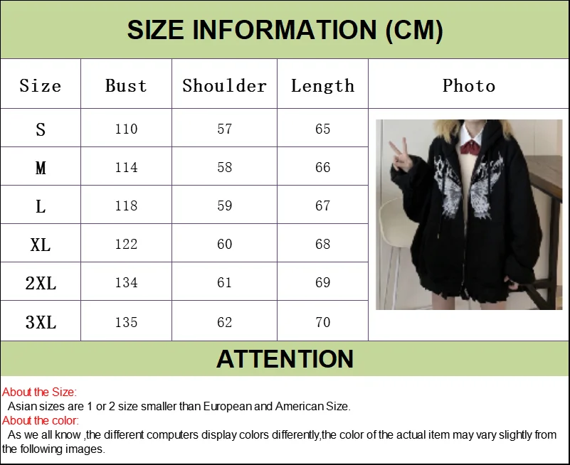 - Product Name: Women Oversized Long Sleeve Zip Up Punk Sweatshirt Butterfly Print Hoodies
