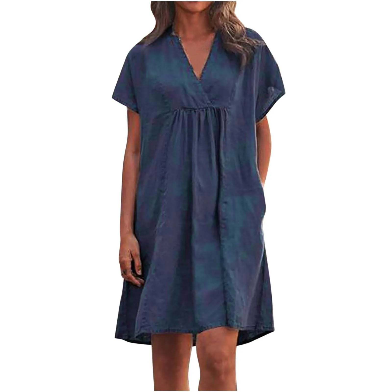 Women Solid Color V Neck Short Sleeve Loose Elegant Casual Dress