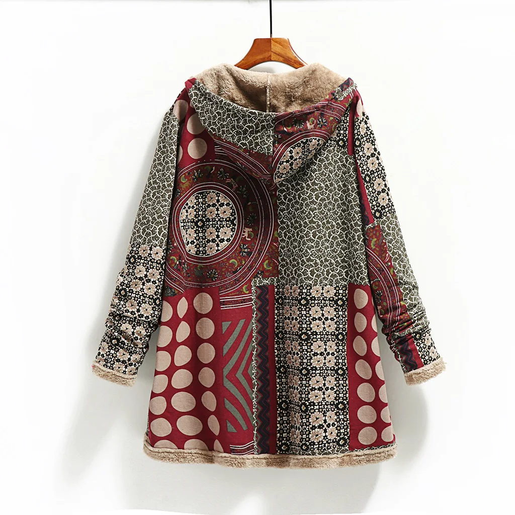 Women's Cotton linen Print Hooded Warm Plush Jacket