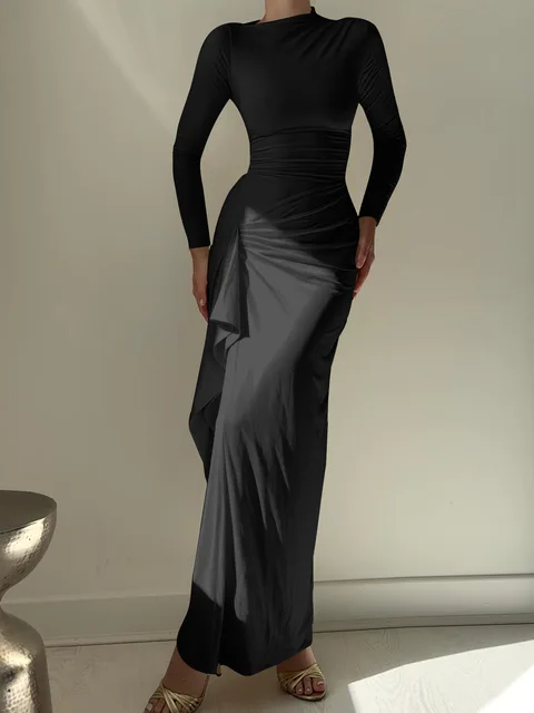 - Product Name: Women's Elegant Ruched Evening Dress – Long Sleeve Slit Party Gown