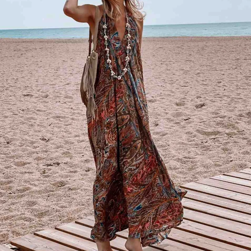 Women's Summer Bohemian Backless Vintage Print Sleeveless Loose Party Maxi Dress
